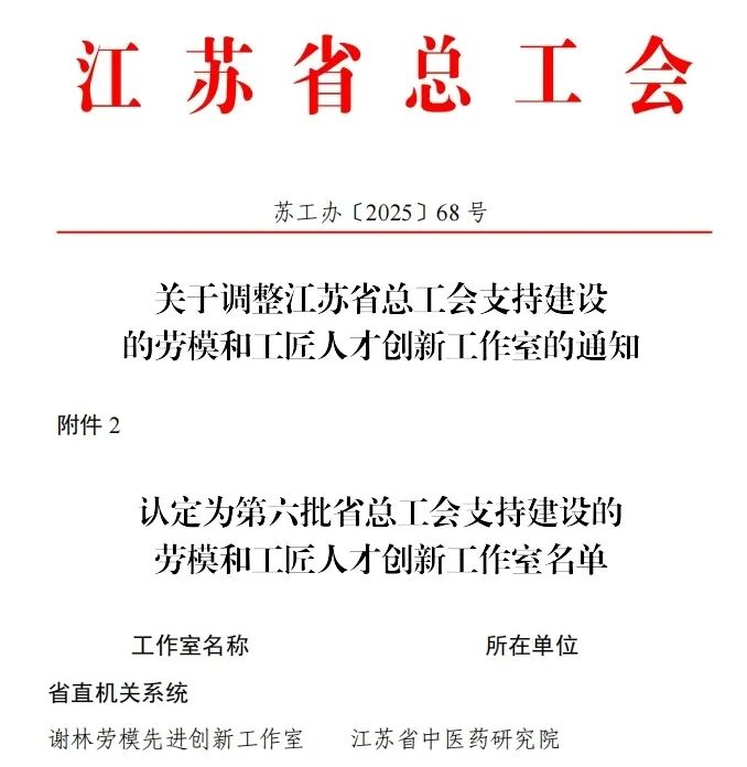 近日,江苏省总工会第六批支持建设的劳模和工匠人才创新工作室名单发布,我校附属中西医结合医院(江苏省中西医结合医院)谢林劳模先进创新工作室成功入选。