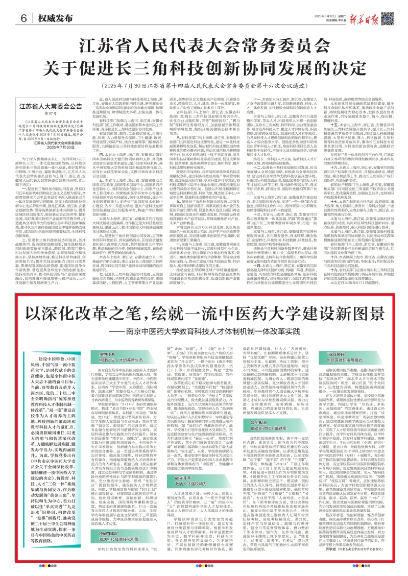 建设中国特色、中国风格、中国气派一流中医药大学,是时代赋予的崇高使命,也是全体南中医人矢志不渝的奋斗目标。2025年8月12日,《新华日报》刊发校党委书记乔学斌署名文章《以深化改革之笔,绘就一流中医药大学建设新图景——南京中医药大学教育科技人才体制机制一体改革实践》。全文如下: