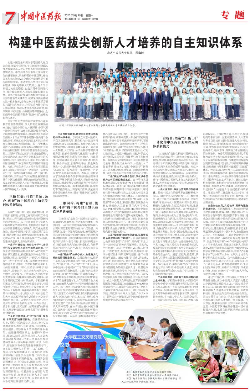 2025年9月29日,《中国中医药报》整版刊发程海波校长署名文章《构建中医药拔尖创新人才培养的自主知识体系》。全文内容如下: