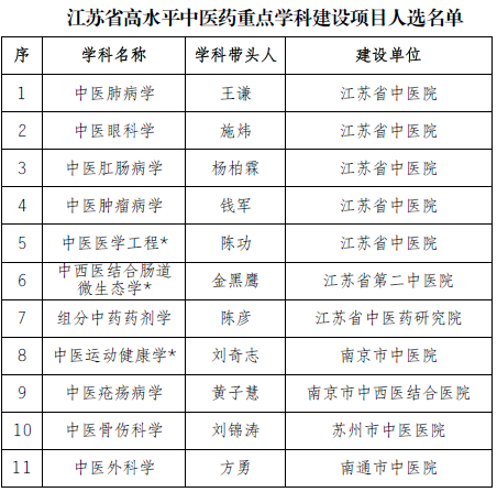 近日,江苏省中医药管理局公布江苏省高水平中医药重点学科建设项目入选名单,确立13个江苏省高水平中医药重点学科建设项目。我校附属医院、校府共建医院11个学科入选,名单如下(学科名称标有“*”的为交叉创新类学科建设项目)。